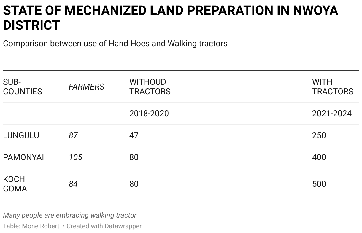 Based in Leb Ngec Centre in Lungulu Sub County, Banya says he adopted mechanized farming using walking tractors in 2017 when the National Agricultural Research Organisation introduced the idea in his area.